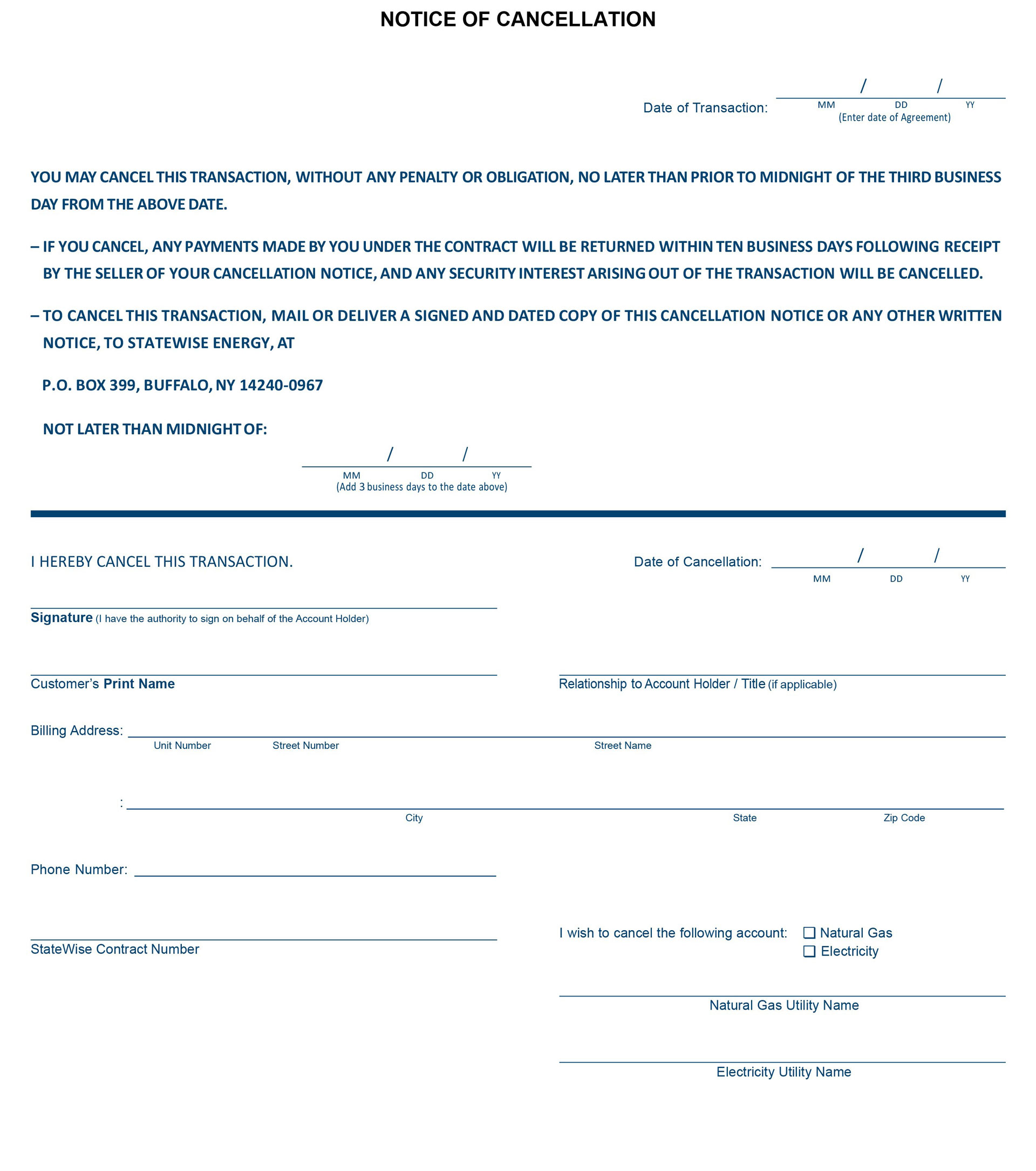 9. Cancellation Provision. Regardless of the Price You chose, You are liable for all StateWise charges until You return to the Utility default service or You switch to another supplier. You may cancel the Agreement(s), at no cost, at any time before midnight of the third business day after receiving a copy of the Agreement(s) by contacting StateWise (see Section 17). If You plan to move to another location, You may transfer this Agreement by notifying StateWise (see Section 17), of Your new Service Address at least forty-five (45) days in advance of the anticipated relocation date. Upon receipt of such notice, StateWise will use reasonable commercial efforts to continue the Program contemplated by the Agreement(s) for the remaining Term of the Agreement(s) at the new Service Address. Your Utility may provide to StateWise a notification of a change of address within Your Utility supply service and, when StateWise receives such notice, it will use reasonable commercial efforts to continue the Program contemplated by the Agreement(s) for the remaining Term of the Agreement(s) at the new Service Address. Otherwise, the Agreement(s) shall be automatically cancelled. You also agree to notify StateWise in writing of any other change of information (including a change of account number, contact information or mailing address) at least sixty (60) days prior to such change taking effect or immediately if the change is to take effect in less than sixty (60) days. If You move from one location to another, a final bill will be rendered after the final scheduled meter reading. However, if a final meter reading is unavailable, an estimate of consumption will be used in the final bill, which will be trued-up subsequent to the final meter reading. The cancellation will become effective on a date determined by Your Utility. If a new provider is not selected, cancellation of the Agreement(s) shall return You to Your Utility supply service. If StateWise seeks to cancel the Agreement(s), StateWise will send You advance written notice within forty-five (45) days. Reasons for cancellation may include but are not limited to: